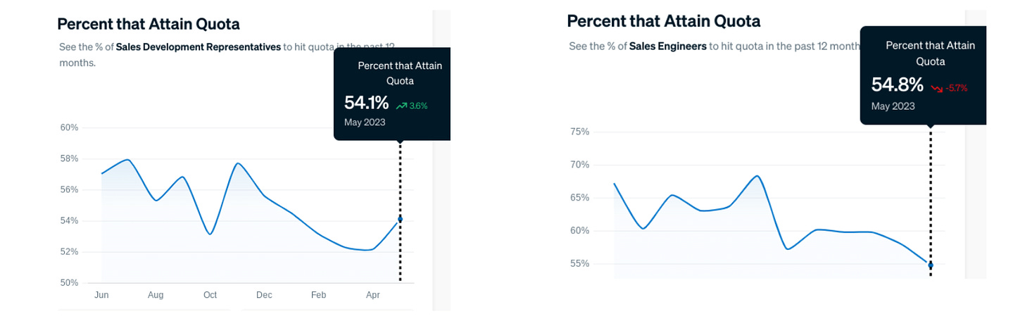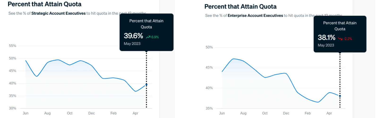 absolute attainment levels are low (the high 30s - mid-40s for AEs), a bit better for forward-looking roles (SDRs and Sales Engineers in the 50's)