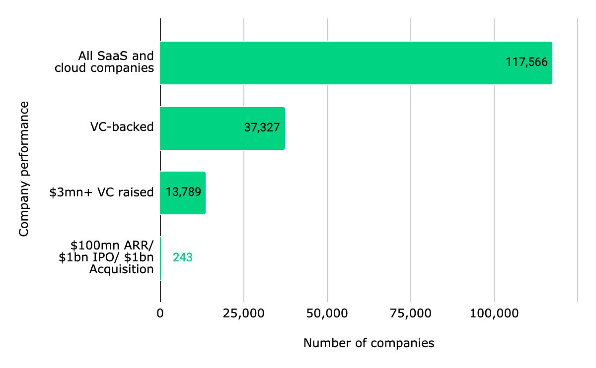 0.6% (i.e. 6 per 1,000 companies!) VC-backed SaaS/cloud companies hit $100m ARR or $1bn IPO/M&A threshold