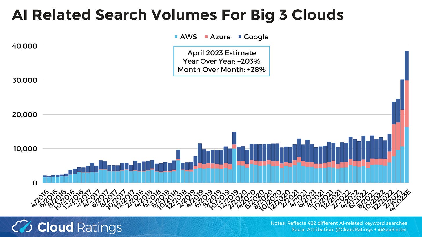 In light of NVIDIA’s historically great, AI-led quarterly guidance, we updated our tracking of AI-related searches (n = 400+ terms) for the Big 3 Clouds (AWS, Azure, Google Cloud): 203%+ YoY growth!