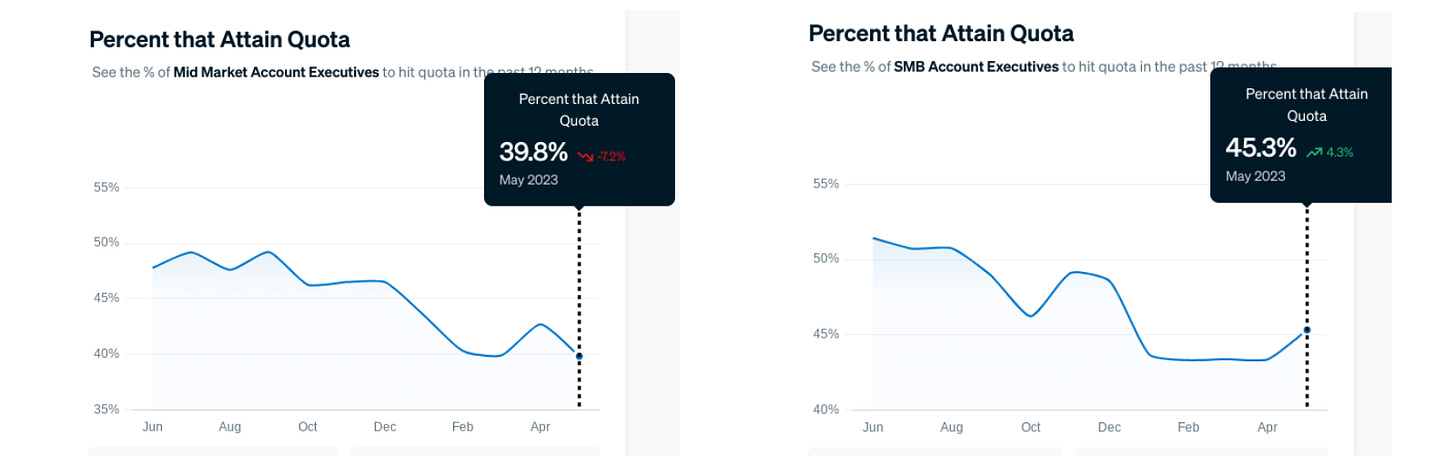 I use RepVue (think Glassdoor for sales, but with better data) quota attainment as a proxy for the state of SaaS sales and revenue trends.