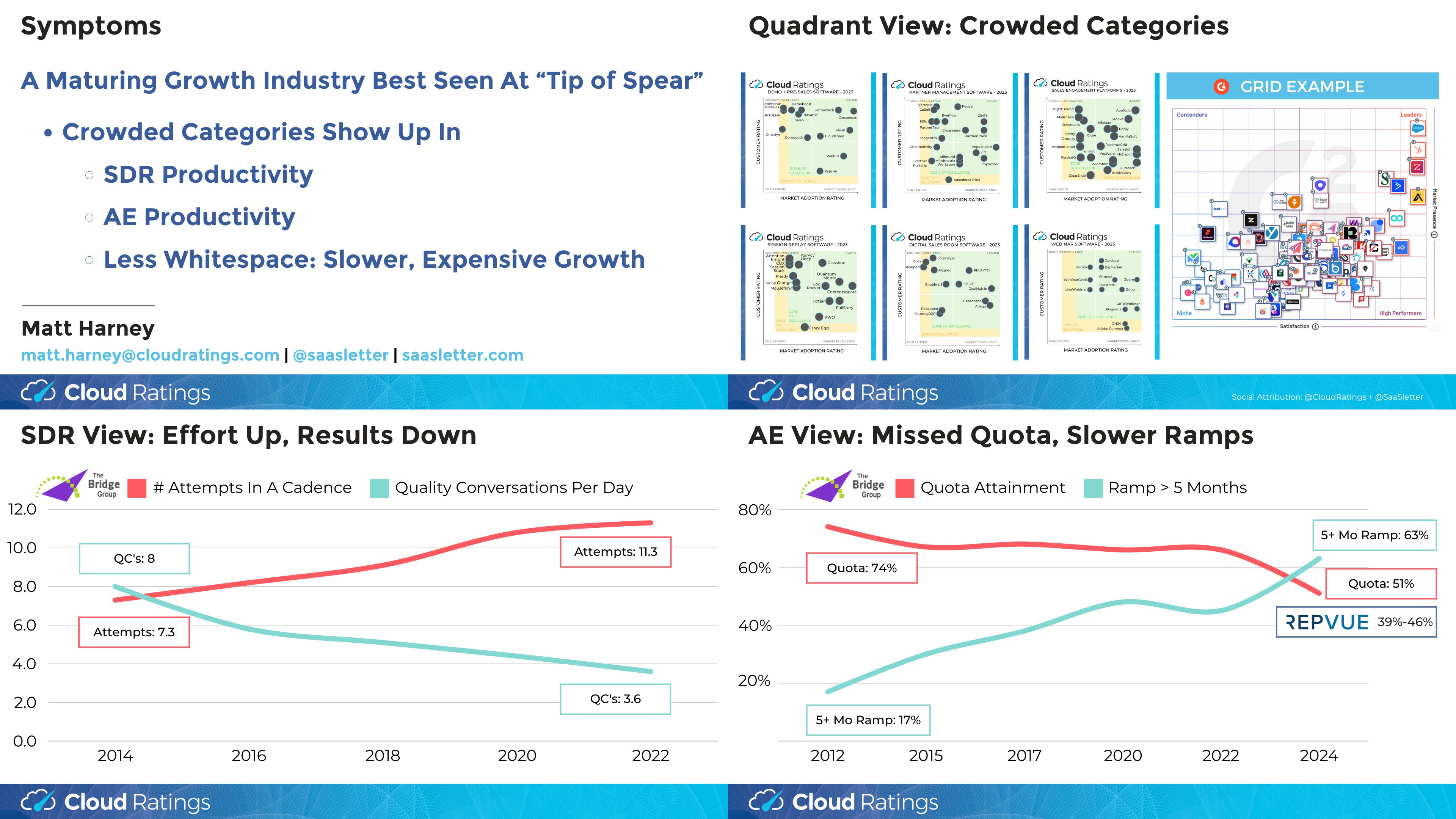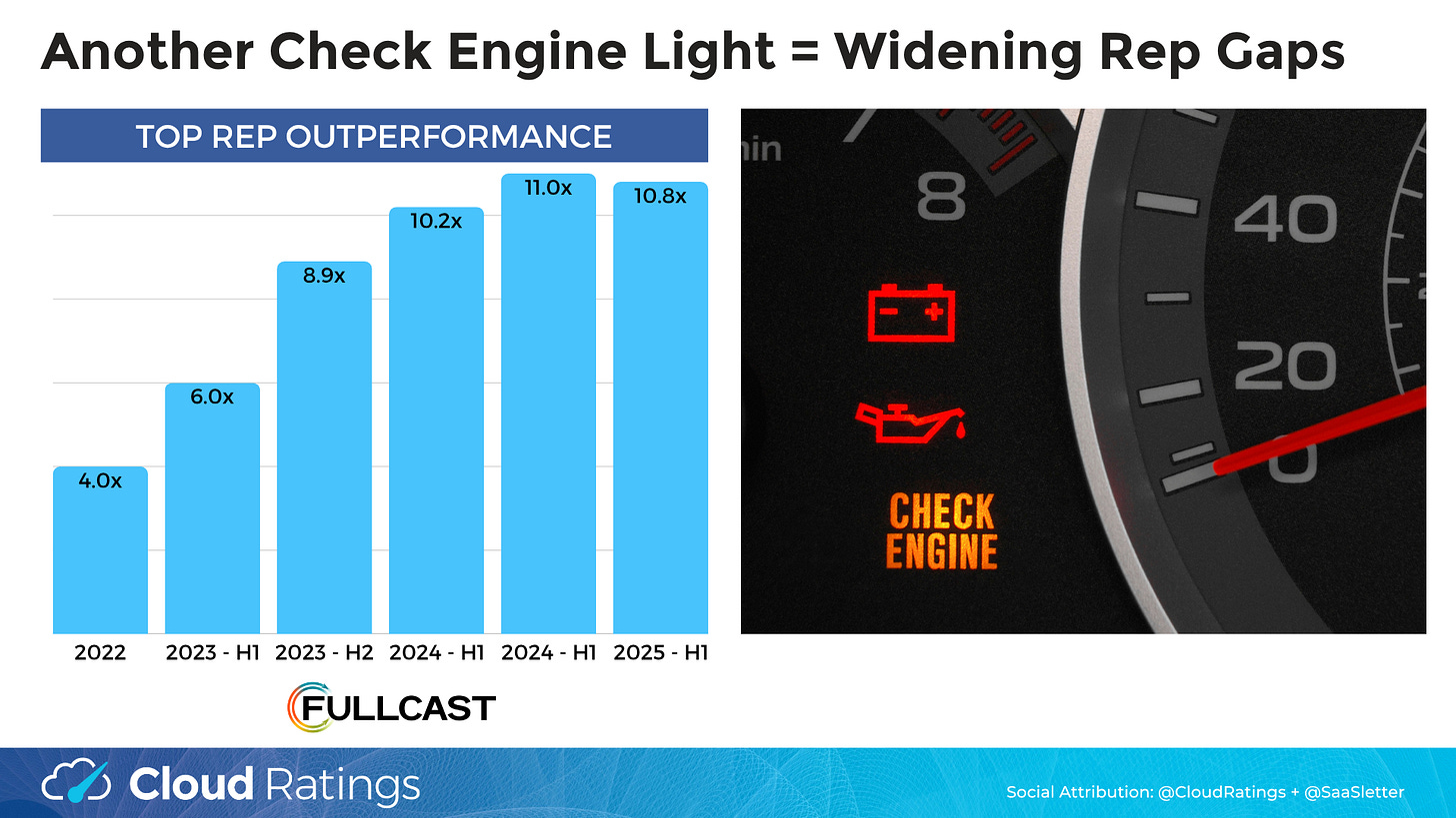 Interestingly, the “sales velocity delta: (i.e., top rep outperformance gap) has stabilized… though it remains a “check engine light” in terms of sales sustainability (fewer AEs driving revenue = more risk):