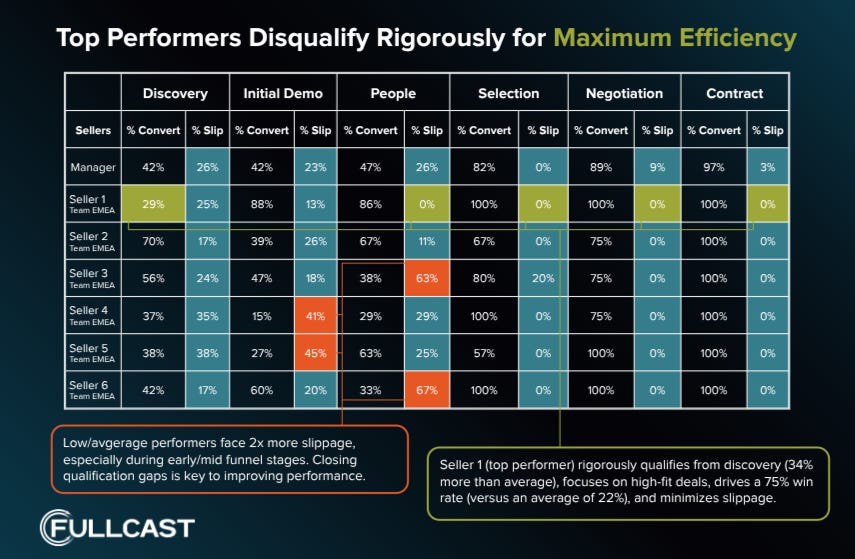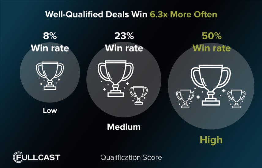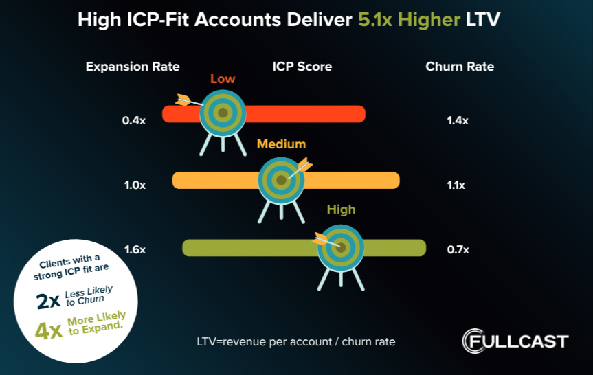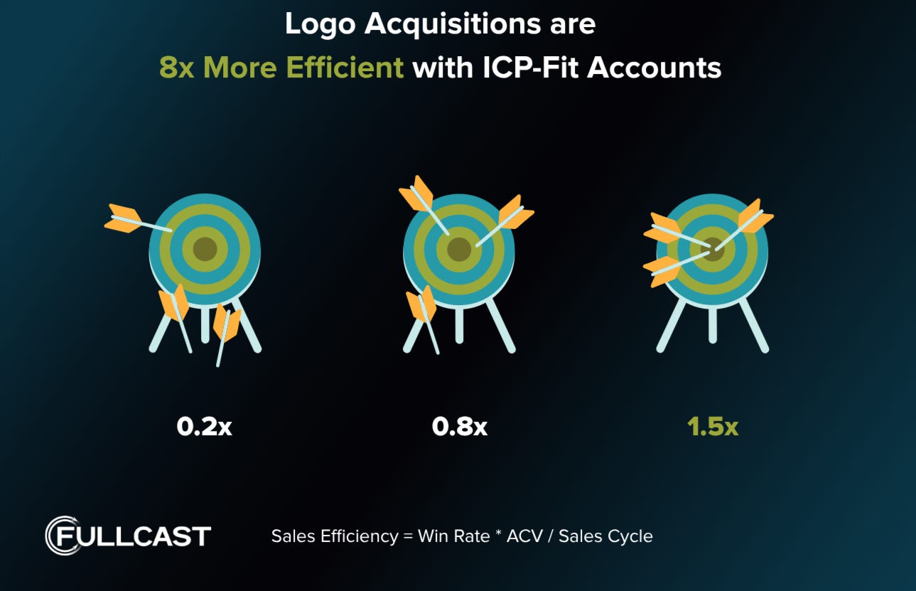 The less obvious (at least to non-operators) issue from a poor ICP mix is the *ongoing drag* of bad-fit deals through the sales cycle. The Fullcast benchmarks show low-fit ICP deals have 87% lower Sales Efficiency (= (Win Rate * ACV) / Sales Cycle).