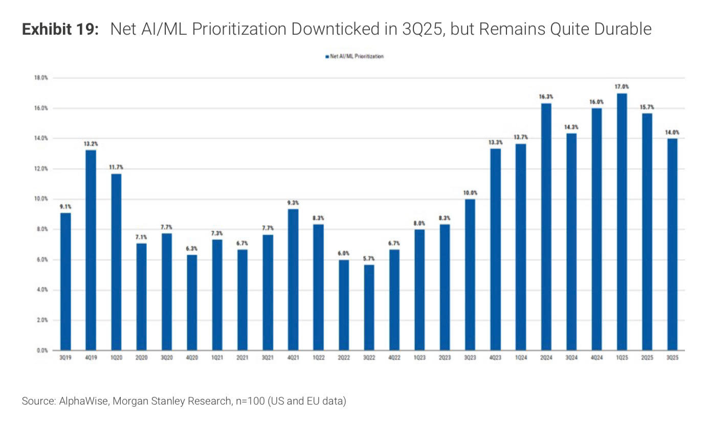 With this moderate weakness aligning with AI/ML Prioritization in Morgan Stanley’s CIO Survey series, which peaked in Q1 2025: