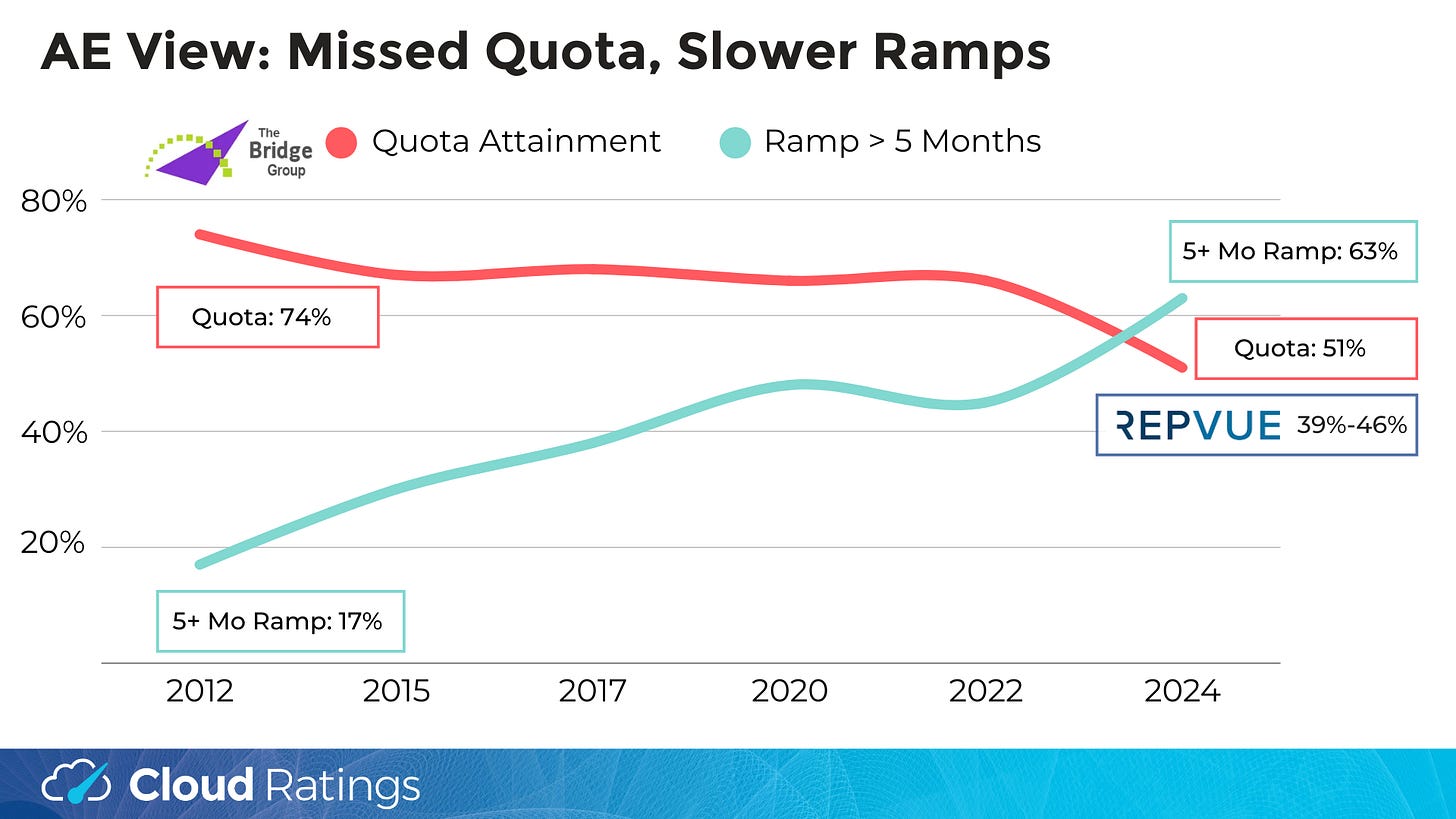 Declining quota attainment and slower ramps have been relentless long-term trends in a “maturing growth industry” - see our 2024 “State of Software” (Full slides, 1st presented at Bowery Capital’s 2024 AGM) - perhaps making top decile outperformance all the more impressive.