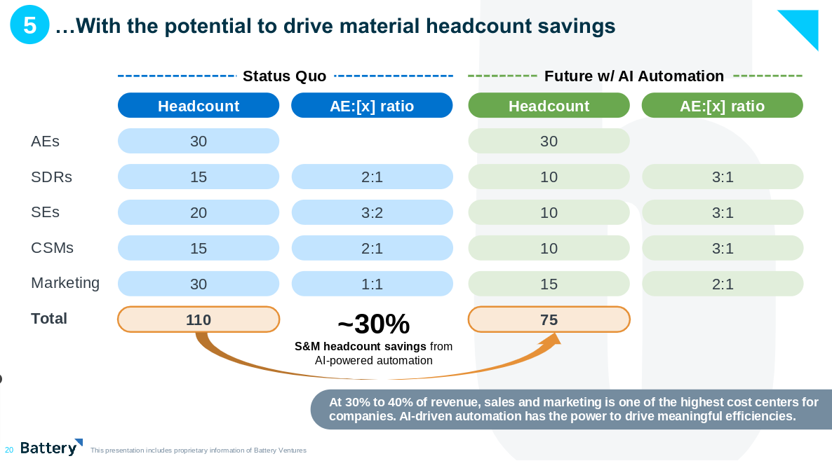 With more granular AI impact estimates by function, like this post-AI GTM org chart, in their report: