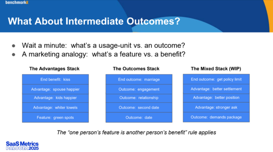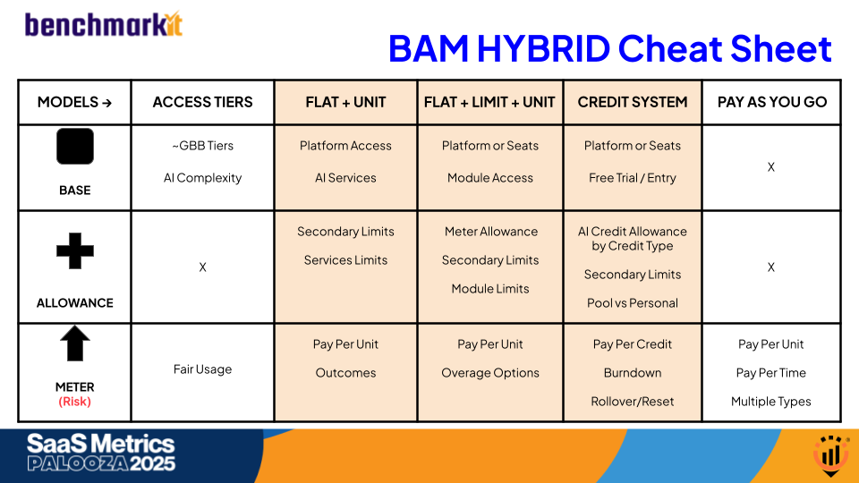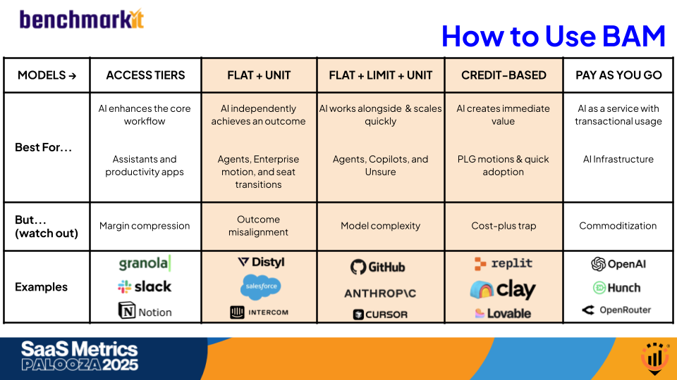 Dave Kellogg’s talk transitions well into Marcos Rivera, Founder + CEO of Pricing I/O, a SaaS pricing consultancy, on “Monetizing AI Without Getting Your SaaS Kicked” - two excerpts from his key “BAM” (Base - Allowance - Meter) framework: