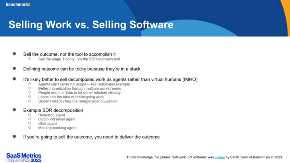 Dave Kellogg (EIR at Balderton) had a thoughtful deck on “Selling Work vs. Selling Software” that gets into some of my favorite topics: *customer* ROI and how software vendors share the value creation (aka value capture + value selling):