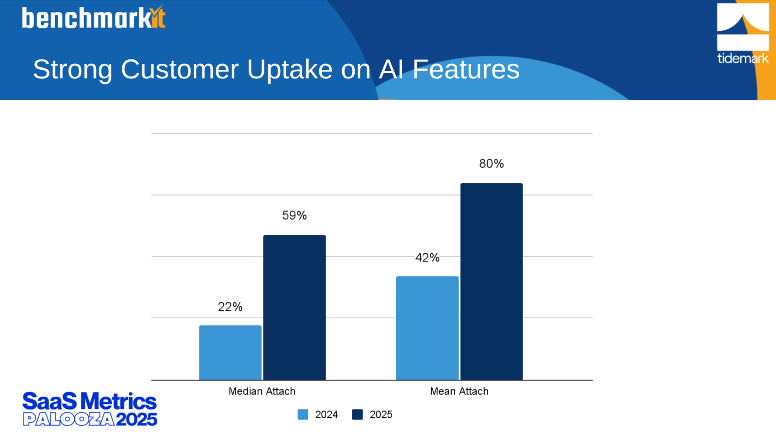 The median AI attach rate has more than doubled (2024: 22% → 2025: 59%)! While noting that attach rate definitions can vary, our read of Tidemark’s 59% for Vertical SaaS is likely a bit ahead of AI adoption rates for (more Horizontal) public companies (see our recent AI quantification summary for 20 PublicCo’s)