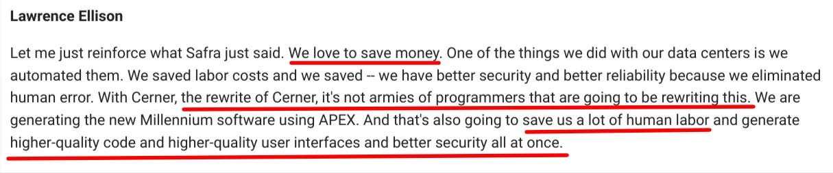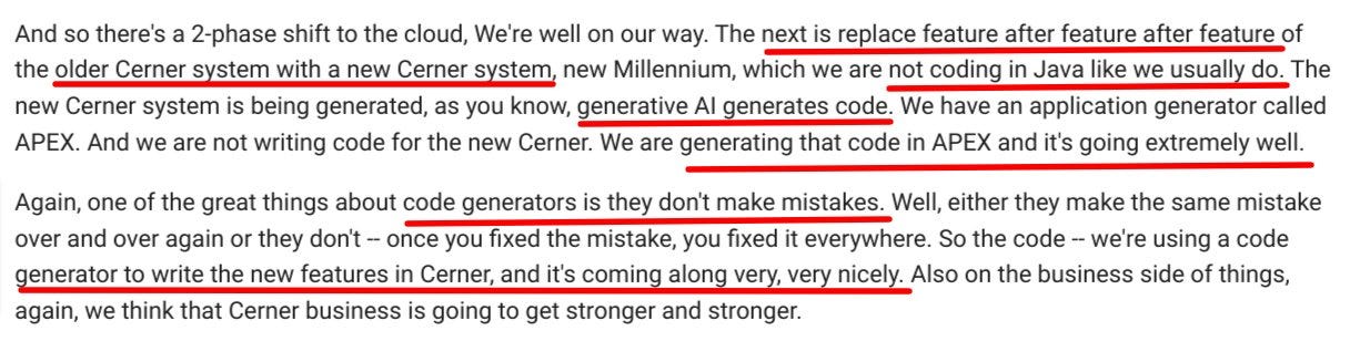 Oracle on their positive results using AI to re-write code base from the Cerner (founded in 1979!) acquisition → do AI coding gains change the investment thesis for legacy + roll-up software platforms?