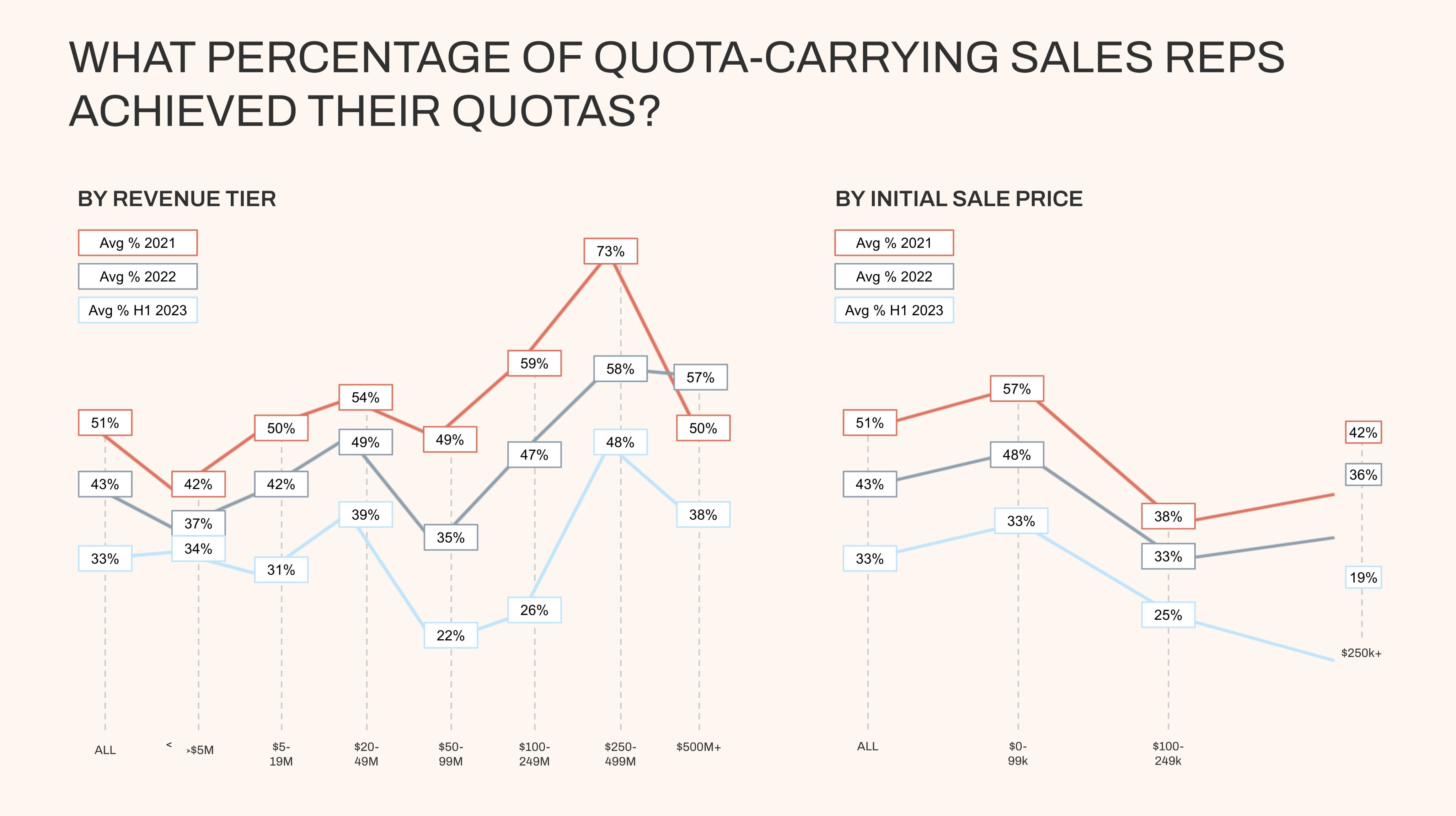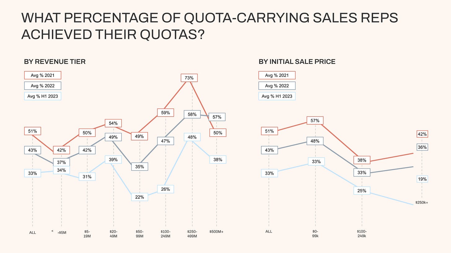 Speaking of quota, Lightspeed’s “2023 GTM & Sales Benchmark Report" (n = 143, largely Series A to Series C) included poor quota attainment data: