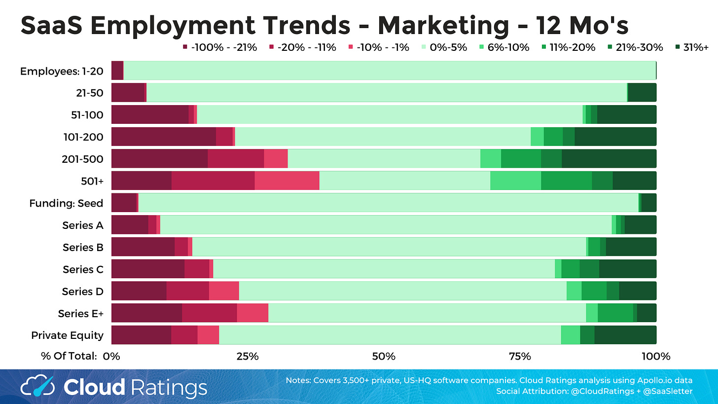 Our second edition of the SaaS Employment Index (covering headcount changes for 3,500+ private software companies) showed meaningful cuts in the Marketing function → this fits my takeaway from Sapphire’s non-AE GTM talk: