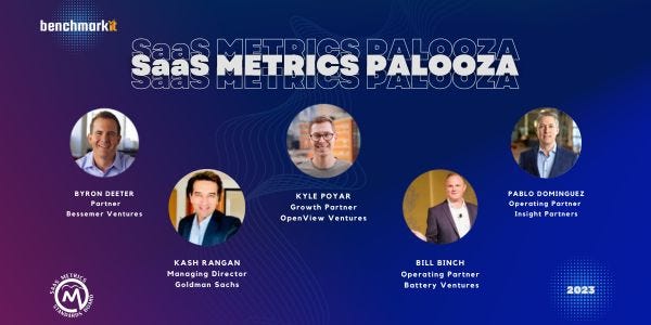 has put together an A-list speaker line-up for his upcoming SaaS Metrics Palooza 2023, whether from the financial community (see above) AND operators (CEO Gong, CFO Gainsight, CEO Vendr, CEO Zylo)Event Details: Date: October 10th-12th, 2023 | Time: 8:00 AM to 5:00 PM PT | Location: Virtual